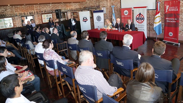 PROVINCIALES – El gobernador Antonio Bonfatti y la ministra de Educación, Claudia Balagué, junto con autoridades de la Unión Industrial de Santa Fe (Uisf), participaron esta mañana de un encuentro entre 100 directores de escuelas técnicas y empresas destinado a consolidar la implementación de las prácticas profesionalizantes, que serán obligatorias desde 2016.Las prácticas profesionalizantes son actividades pedagógicas no rentadas que integran la propuesta curricular de las escuelas de Educación Técnico-Profesional de la provincia de Santa Fe, que comenzaron a instrumentarse en 2013, a través de un convenio marco que el gobierno de Santa Fe firmó con la Federación de Industriales de la Provincia de Santa Fe (Fisfe) e involucra a más de 800 empresas.