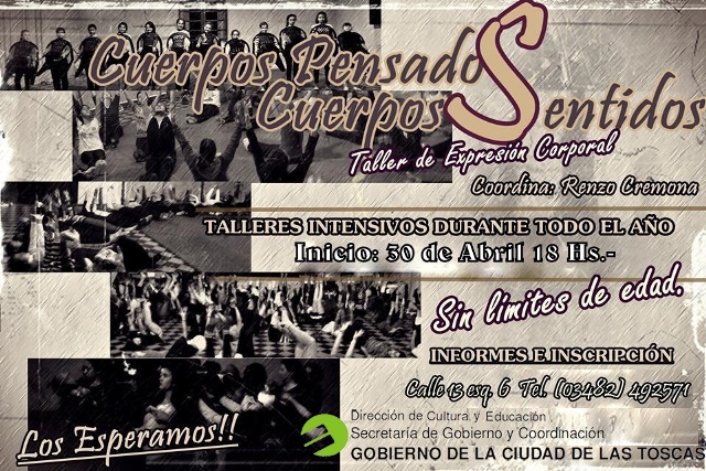 LAS TOSCAS – La Dirección de Cultura y Educación del gobierno de la ciudad informa que el próximo jueves 30 de abril, dará inició el Taller de Expresión Corporal “Cuerpos Pensados, Cuerpos Sentidos” a cargo del Profesor Renzo Cremona, como parte del Programa Cultural Provincial “Lazos”.Desde las 18 Hs., se iniciará el dictado del mismo, siendo de carácter intensivo y abierto para toda la comunidad y especialmente a artistas de baile y teatro de la localidad y región en el SUM de la Casa de la Cultura.