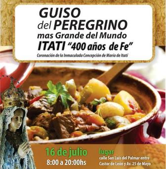 Como parte de las actividades a desarrollarse este 16 de Julio, con motivo de la Coronación Pontificia de Nuestra Señora de Itatí, y en el marco de los festejos de “Itatí 400”, la Asociación Vecinal Padre César Corazza se encuentra organizando el guiso del peregrino más grande del mundo. Este mega evento tendrá lugar desde las 8:00, hasta las 20:00 horas aproximadamente, en la localidad de Itatí, más precisamente en la calle San Luís del Palmar entre 25 de Mayo y Castor de León. En la oportunidad habrá también un desfile de orquestas folklóricas mientras preparan y comparten esta comida comunitaria de 12 mil porciones.