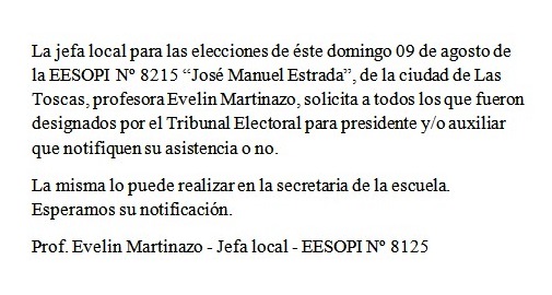 Política Las Toscas: Comunicado para estas PASO de la EESOPI N°8125 3 agosto, 2015 Compartir en Facebook Compartir en Twitter tweet