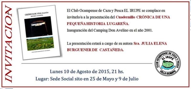 El Club Ocampense de Caza y Pesca «El Irupé» de la ciudad de Villa Ocampo, invita a la presentación del cuadernillo «Crónica de una pequeña historia lugareña», inauguración del camping Don Avelino en el año 2001.