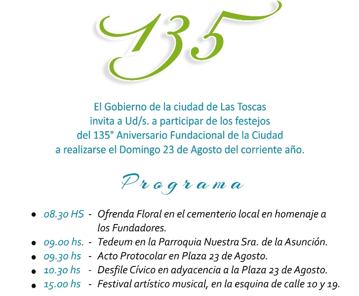 El gobierno de la ciudad de Las Toscas, invita a participar del Cronograma de Festejos del 135 Aniversario Fundacional de la Ciudad.