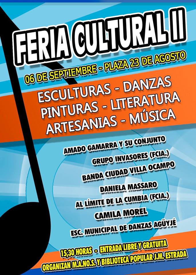 Organizado por la BIBLIOTECA POPULAR J.M ESTRADA y el grupo MANOS (Músicos autoconvocados del Norte Santafesino), este domingo 6 de setiembre, por la tarde en la plaza central de la ciudad de Las Toscas, se llevará a cabo la II Feria cultural, donde habrá números musicales, exposición artesanal, pinturas, literaturas y otros.