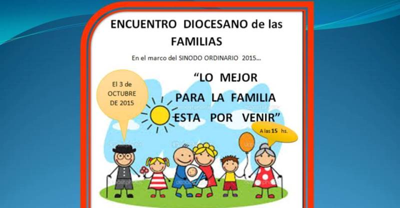 En coincidencia con el inicio del Sínodo Ordinario sobre la Familia a realizarse del 4 al 25 de octubre de este año en el Vaticano, la Comisión Diocesana de Pastoral Familiar invita a participar el día 03 de octubre a partir de las 15 hs. del Encuentro Diocesano de las Familias que se llevará a cabo en el Complejo Cultural “La Estación” de la ciudad de Reconquista.