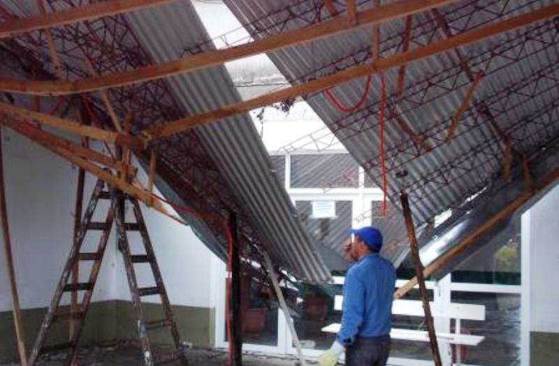 “El hall estaba sostenido por una cabreada de hierro y apoyado sobre ladrillo cerámico con una profundidad de no más de 4 centímetros, de milagro no cayó antes”, comentó el Ingeniero Gustavo Mana, Secretario de Infraestructura y Medio Ambiente de la Municipalidad, organizando los trabajos para retirar el techo caído.