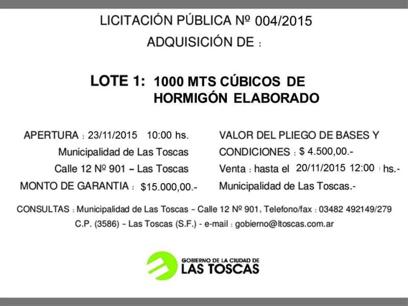 El Gobierno de la Ciudad de Las Toscas, hace llamado a licitación 003/2015 y 004/2015 para la adquisición de mil toneladas de piedra y mil metros cúbicos de hormigón elaborado según pliego de bases y condiciones en ambos casos.