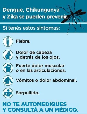 El dengue se trasmite por la picadura del mosquito Aedes argypti, y en caso de «presentar síntomas tales como fiebre y dolor detrás de los ojos, de cabeza, muscular y de articulaciones; náuseas y vómitos; cansancio intenso; aparición de manchas en la piel; picazón y sangrado de nariz y encías, la cartera sanitaria recomienda no automedicarse y acudir al médico lo antes posible para recibir un diagnóstico. No se debe tomar aspirinas, ibuprofeno ni aplicarse inyecciones intramusculares», indicó.