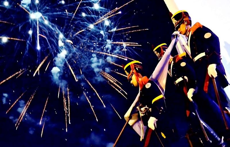 El público se puso de pié y entonó el Himno Nacional, cantado en vivo desde el mismo escenario por Rosita Leiva y el acompañamiento musical de guitarras. Al finalizar la canción patria, comenzó un extenso espectáculo de fuegos de artificios que coronó la emoción que inundó a los presentes.