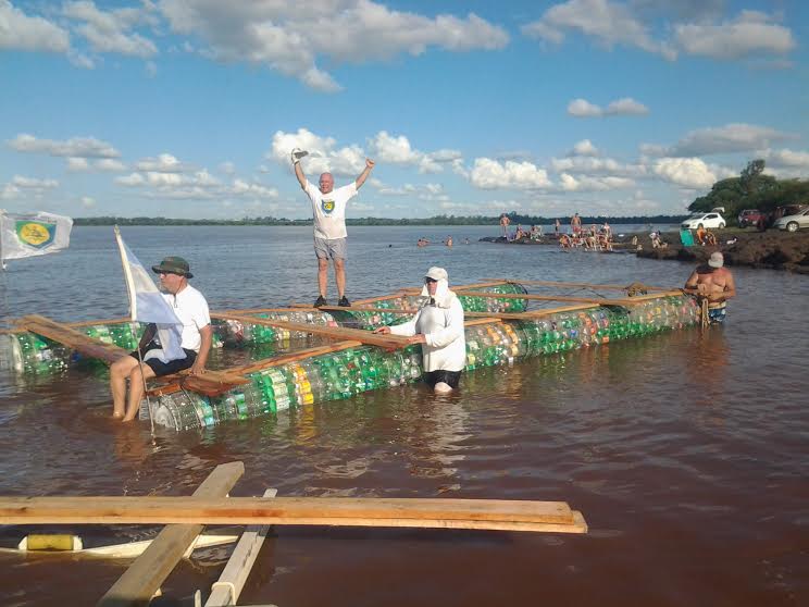 Hoy, a 6 años de aquel raid náutico por el río Uruguay, los jangaderos, reiniciamos con entusiasmo el nuevo proyecto de navegar en marzo de 2016 por el Río Uruguay desde Puerto San Javier, Misiones a Monte Caseros, ctes. en una etapa a cumplir de 470 kms; solo que en esta oportunidad se viajará sobre una balsa – jangada, confeccionada con botellas descartables y el proyecto llevará el nombre de “recorriendo el camino de los pueblos libres”. Esta balsa contará con 4 años de 6 mts por 8 metros, lo que en la estructura general, tendrá un total de 26 mts de largo por 8 metros de ancho. El armado se realizó de la siguiente manera: 12 mallas cimas, cada una de ellas fueron enroscadas, arrolladas como tubos= 3+3+3+3= 12 dentro de ellas se colocaron botellas -(700) —formando un cilindro. Sobre los tubos se colocan maderas para caminar al medio se erige un mástil para las 3 banderas de: Argentina, Brasil y Uruguay atrás se arma el “bendito” o casilla para centro de operaciones y rancho.