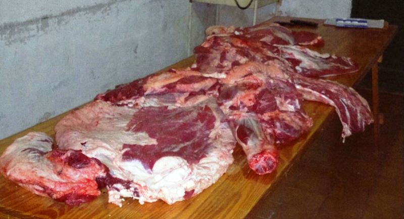 En misma, se desplazaban dos masculinos mayores de edad, quienes transportaban en el asiento trasero del rodado y envuelto en un nylon la cantidad (70) SETENTA KILOGRAMOS DE CARNE VACUNA y (05) CINCO KILOGRAMOS DE CHORIZO sin documentación que acredite su propiedad y/o sanidad.