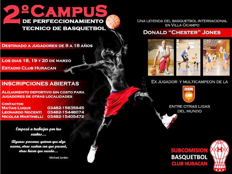 El próximo viernes 18, sábado 19 y domingo 20 de Marzo se desarrollará en el gimnasio cubierto del Boulevar Sarmiento el 2° Campus de perfeccionamiento organizado por la sub-comisión de básquet del Club Huracán.