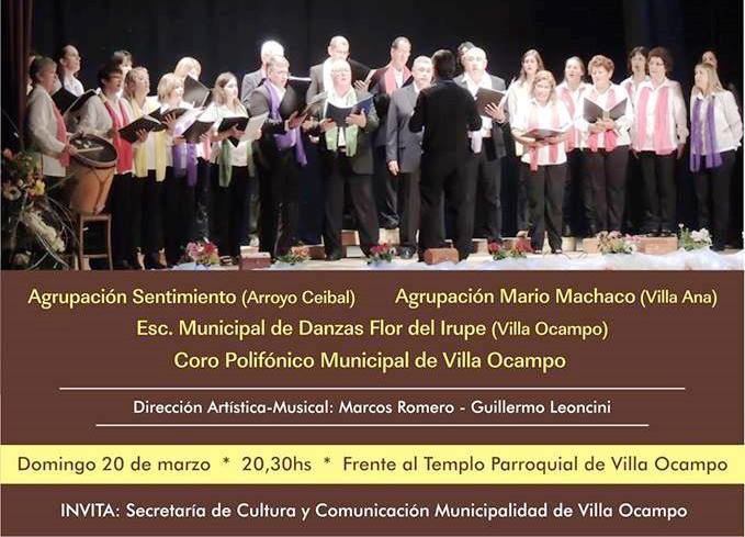 La Secretaría de Cultura y Comunicación de la Municipalidad de Villa Ocampo invita a presenciar la obra musical-dancística “La Misa Criolla”, que presentarán en forma conjunta el Ballet Municipal “Flor del Irupé” y el Coro Polifónico Municipal.