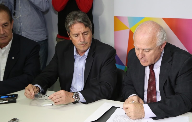 El gobernador de Santa Fe, Miguel Lifschitz, junto a los ministros de Infraestructura y Transporte, José Garibay, y de Medio Ambiente, Jacinto Speranza, abrió este lunes los sobres para la ejecución de la quinta etapa del Acueducto Reconquista.
