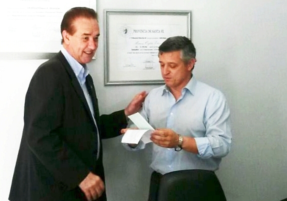 Haciendo la entrega a la Asociación de Vóley del Norte Santafesino