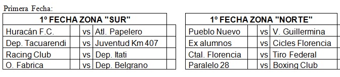 Zona Sur: Ocampo Fabrica, Huracán F.C., Racing Club, Juventud Km 407, Deportivo Belgrano, Atlé-tico Papelero, Dep. Itati de Villa Ana y Dep. Tacuarendi.