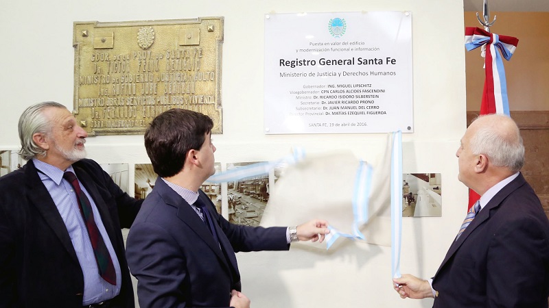 El gobernador Miguel Lifschitz, acompañado por el ministro de Justicia y Derechos Humanos, Ricardo Silberstein, inauguró este martes en la ciudad de Santa Fe las obras de ampliación y refacción de las oficinas del Registro de la Propiedad, que demandaron una inversión superior a $ 1.500.000.