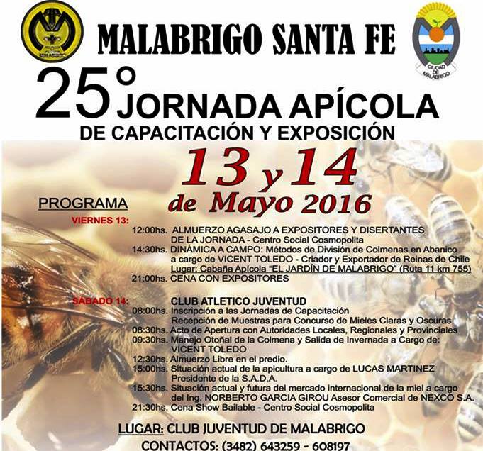 Invitan a todos los apicultores, a la XXV JORNADA DE EXPOSICIÓN Y CAPACITACIÓN DE MALABRIGO A REALIZARSE EL PRÓXIMO 13 y 14 de Mayo.