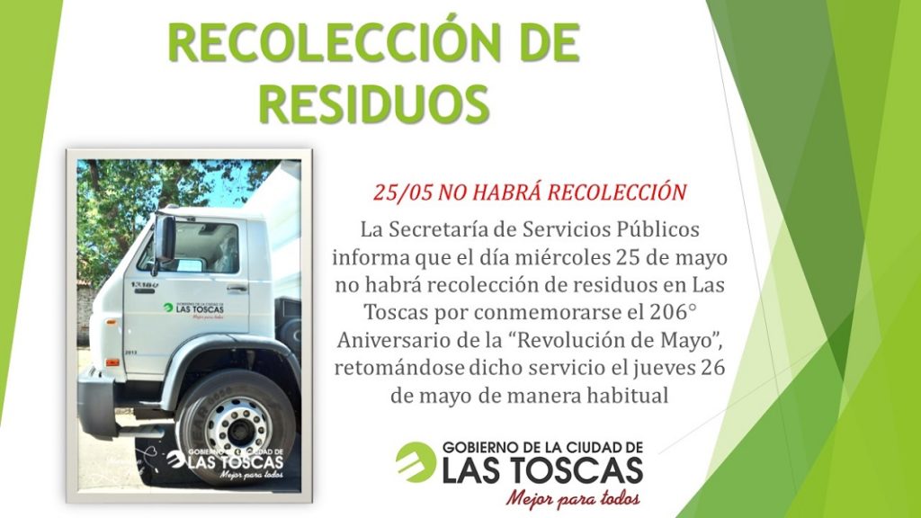 La Secretaría de Servicios Públicos del Gobierno de la Ciudad de Las Toscas, comunica a la población que con motivo del feriado del día 25 de mayo con motivo del 206° Aniversario de la “Revolución de Mayo y Primer Gobierno Patrio” que los servicios de recolección de residuos no se realizarán durante la jornada mencionada.
