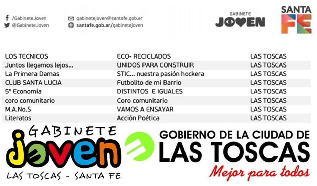 El Gabinete Joven del Gobierno de la Ciudad de Las Toscas, informa a la comunidad que en el marco del Programa Ingenia en su 7ma edición, se han presentado un total de 22 proyectos de jóvenes tosquenses de los cuales 8 han sido favorecidos en esta oportunidad.