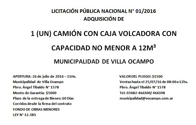 La Municipalidad de Villa Ocampo llama a Licitación Pública Nacional (01/2016) para la adquisición de un camión con caja volcadora, con capacidad no menor a 12 m3.