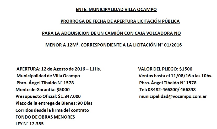 La Municipalidad de Villa Ocampo llama a Licitación Pública Nacional (01/2016) para la adquisición de un camión con caja volcadora, con capacidad no menor a 12 m3.