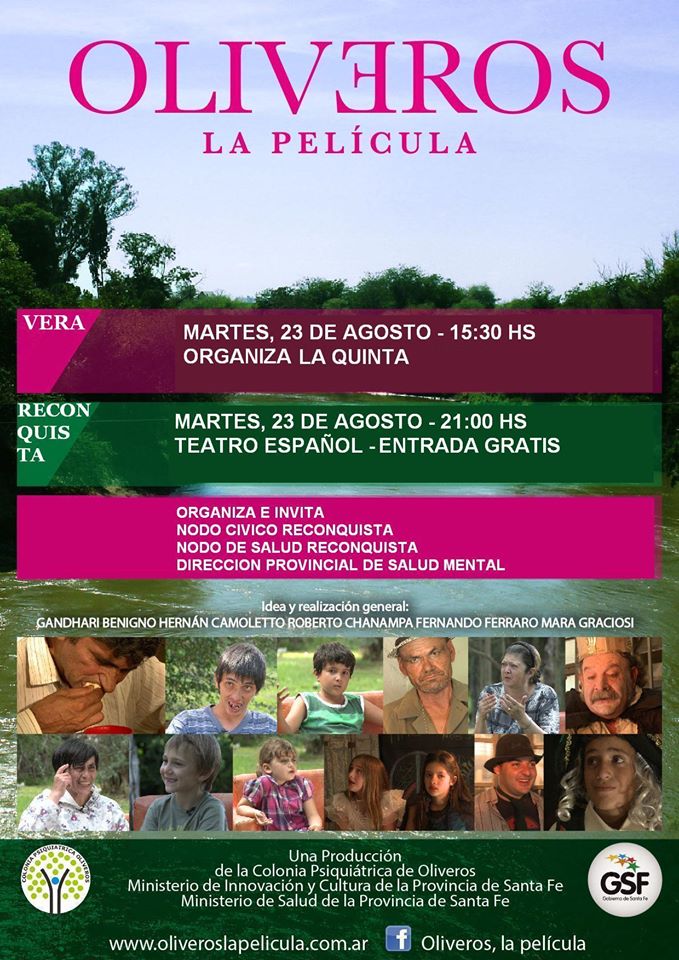 La misma se proyectará éste martes 23 de agosto, a las 21, en el marco del Cine Club de la ciudad de Reconquista en el Teatro Español. Previamente, a las 15,30, Oliveros se proyectará en la ciudad de Vera coordinado por La Quinta de esa ciudad.