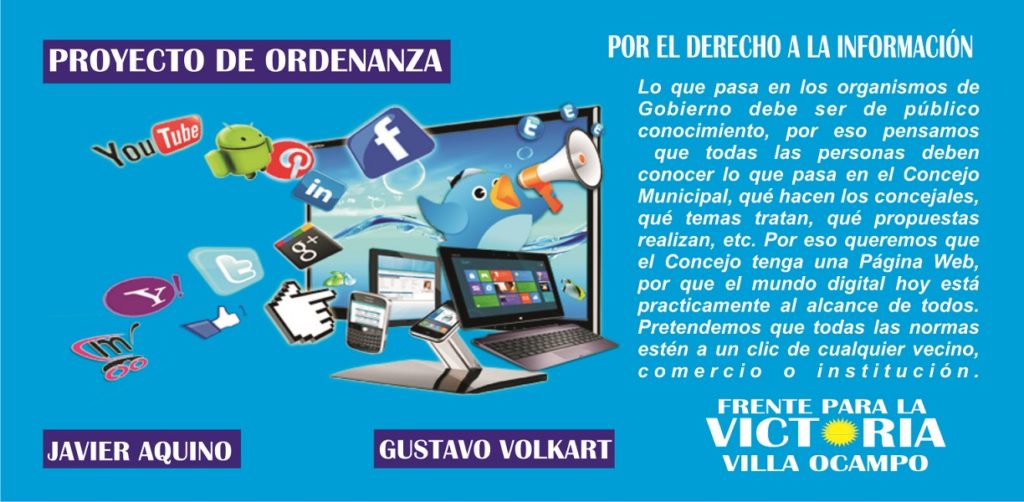 El Bloque de Concejales Justicialistas del FPV presentó una propuesta para que el Concejo Municipal cuente con una página web institucional. El proyecto se sustenta en el derecho a la información que poseemos todos como ciudadanos y cuando nos referimos a organismos de gobierno esto toma mayor relevancia. Queremos generar una herramienta comunicacional que permita que cualquier vecino desde su casa, desde una computadora o desde su celular mismo pueda saber qué está pasando en el Concejo Municipal, qué temas se está tratando, qué propuestas hay, quiénes la llevan a cabo, etc.