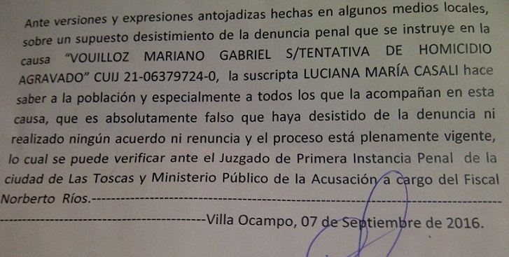 Ante versiones que surgieron en los últimos días que se iba a desistir de continuar con el juicio contra Mariano Vouilloz por TENTATIVA DE HOMICIDIO, Luciana Casali emitió un comunicado desmintiendo los comentarios que se hicieron público y afirma que continúa hasta que llegue el juicio.
