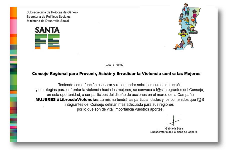 El Intendente del Gobierno de la Ciudad, invita a la comunidad a la 2° Reunión del Consejo Regional para Prevenir, Asistir y Erradicar la Violencia contra las Mujeres. Teniendo como función asesorar y recomendar sobre los cursos de acción y estrategias para enfrentar la violencia hacia las mujeres, se convoca a los integrantes del Consejo, en esta oportunidad, a ser partícipes del diseño de acciones en el marco de la Campaña MUJERES #LibresdeViolencias. La misma tendrá las particularidades y los contenidos que los integrantes del Consejo definan más adecuada para esta región, por lo que son de vital importancia vuestros aportes.