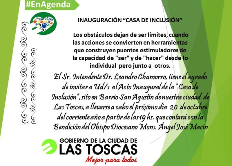 El gobierno de la ciudad de Las Toscas, invita a la Inauguración de la Casa de Inclusión que se llevará adelante el próximo Jueves 20 de Octubre a las 19 horas, y que además, contará con la presencia y bendición de las instalaciones, el Obispo Ángel José Macín.