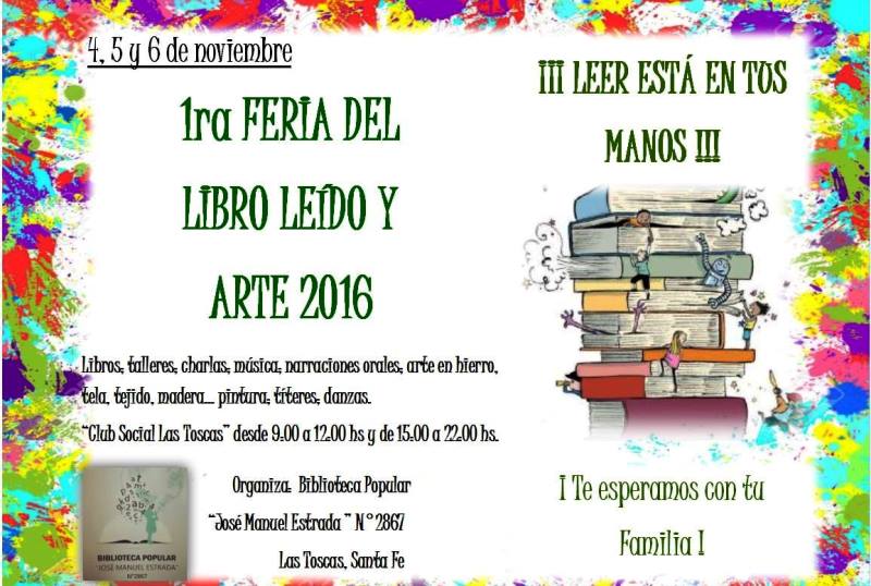Invitan a la “1ª FERIA DEL LIBRO LEÍDO Y ARTE” que se realizará en las instalaciones del “Club social Las Toscas”, donde se podrá recorrer y disfrutar de las muestras de libros para la venta y canje (contamos con la presencia de la librería «Los libros de la Buena Memoria» de la ciudad de Reconquista), talleres y diversos espectáculos artísticos y culturales que se desarrollarán durante los días 4, 5 y 6 de noviembre.
