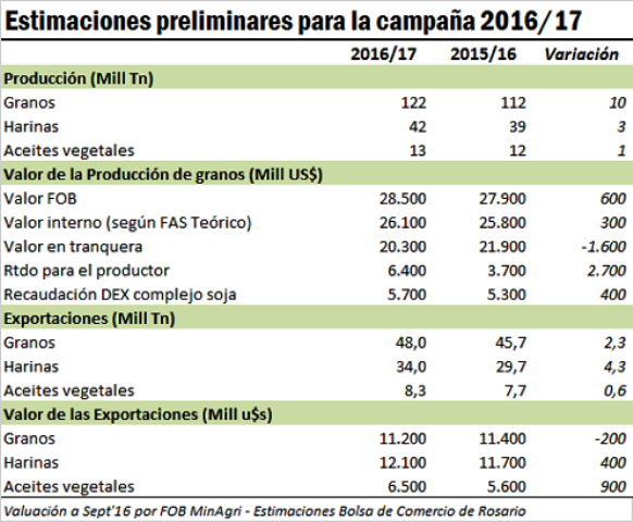 La campaña 2016/17 podría dejar, estimativamente, un saldo de producción de más de 122 millones de toneladas de granos, que valuadas por el precio doméstico esperado a cosecha según se obtiene del FAS Teórico, equivaldría a u$s 26.100 millones. A ello se le sumarán, además, 13 millones de toneladas de aceites vegetales y 42 millones de harinas y subproductos. Aproximadamente 90 millones de toneladas de granos y subproductos tendrán como destino el mercado internacional, facilitando un ingreso de divisas por casi 30.000 millones de dólares, 1.000 millones de dólares más que en la anterior campaña 2015/16.