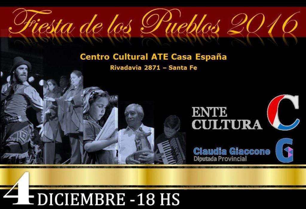 El Ente Cultural Santafesino informa que el Domingo 4 de diciembre a partir de las 18hs en las instalaciones del Centro Cultural ATE- Casa España, sito en calle Rivadavia Nº 2871 se desarrollará la «Fiesta de los Pueblos».
