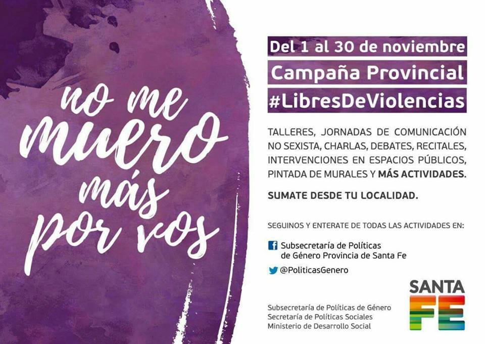 La subsecretaría de Políticas de Género del gobierno de Santa Fe lleva adelante la campaña #LibresDeViolencias. En la misma, se desarrollan acciones propuestas por integrantes de los Consejos Regionales para la Prevención, Asistencia y Erradicación de la Violencia hacia las mujeres que tienen como objetivo informar sobre los recursos estatales de asesoramiento y denuncia de los distintos tipos y modalidades de violencia.