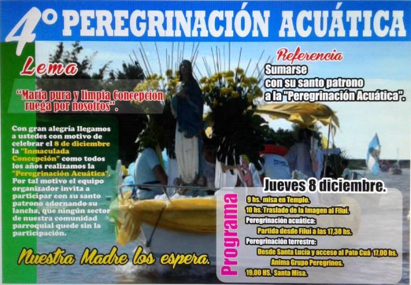 Bajo el lema «María pura y limpia Concepción ruega por nosotros, se llevará a cabo este jueves 8 de diciembre la cuarta peregrinación acuática, desde los de Filuí hasta las instalaciones del club Pato Cuá.