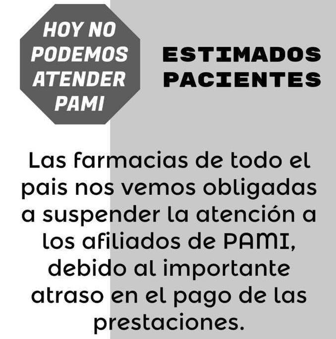 Comunicamos que habiendo concluido la anunciada reunión entre las entidades farmacéuticas y el Director Ejecutivo del PAMI, y no habiendo obtenido de parte del Dr. Regazzoni ninguna respuesta positiva a nuestras propuestas y reclamos para obtener un convenio sustentable sanitariamente, sostenible económicamente para las farmacias y que no afecte el bolsillo de los jubilados, sumado a que la Industria Farmacéutica no cumple con sus compromisos de pago a las farmacias generando una deuda que se mide ya en miles de millones de pesos, las farmacias de todo el país dejarán de otorgar crédito a los afiliados del PAMI a partir de la hora cero del miércoles 21 de diciembre.