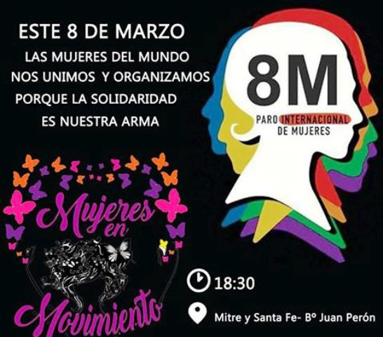 «Nos convocaremos el miércoles 8 de marzo, a las 18:30hs, en la esquina Mitre y Santa Fe (B° Juan Perón). Tu presencia y tu voz son importantes. Vení! Sumate! Juntas fortalecemos nuestra lucha. Juntas gritaremos más fuerte #NiUnaMenos #VivamosNosQueremos», expresan el grupo de mujeres en movimiento Villa Ocampo.