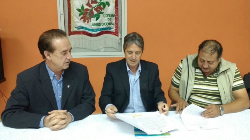El ministro de Infraestructura y Transporte, José Garibay, junto al presidente comunal de Arroyo Ceibal, Raúl Félix Cioccale, firmaron este viernes el convenio para la construcción y mejorado de un camino de carga pesada en esa localidad del departamento General Obligado.