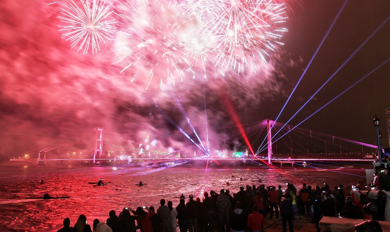 A las 17 horas comenzaron las demostraciones náuticas con embarcaciones pequeñas a cargo de los clubes e instituciones Yacht club, Náutico Sur, Regatas, Azopardo, Marinas y de las guarderías náuticas. Estas culminaron con una caravana de embarcaciones grandes por la laguna que pasaron por debajo del puente. Finalmente, a las 19 horas, comenzó la cuenta regresiva con show de fuegos artificiales y láseres (de 7 minutos), para coronar con la iluminación total del Puente Colgante.