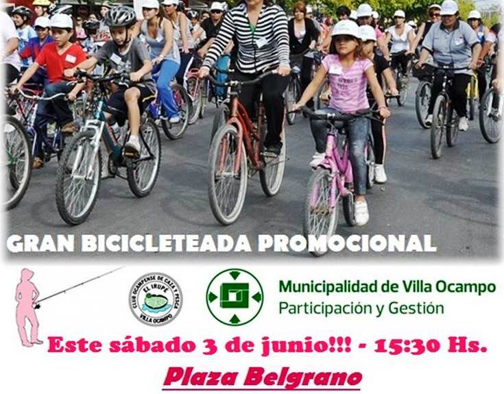 La Dirección de Deportes de la Municipalidad de Villa Ocampo, junto a la Sub-Comisión de Damas del Club Ocampense de Caza y Pesca “El Irupé”, invitan a participar de manera libre y gratuita de la Gran Bicicleteada Promocional de la 5º Fiesta Provincial de Pesca Variada Embarcada para Mujeres.