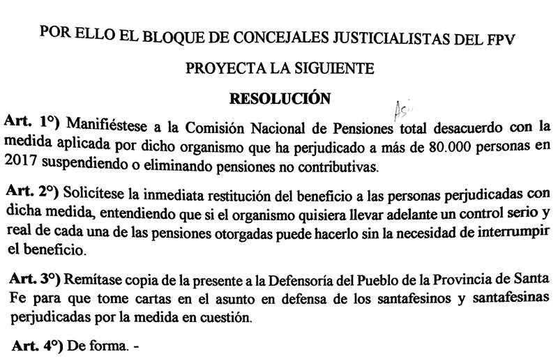 El Bloque de Concejales Justicialistas promovió una resolución en contra de la quita y suspensiones masivas de Pensiones No Contributivas. La Resolución, aprobada por unanimidad, está dirigida a la Comisión Nacional de Pensiones Asistenciales a quien pide se restituya de inmediato los beneficios interrumpidos de forma indiscriminada, y también corre comunicación a la Defensoría del Pueblo para que actúe en defensa de los santafesinos perjudicados.