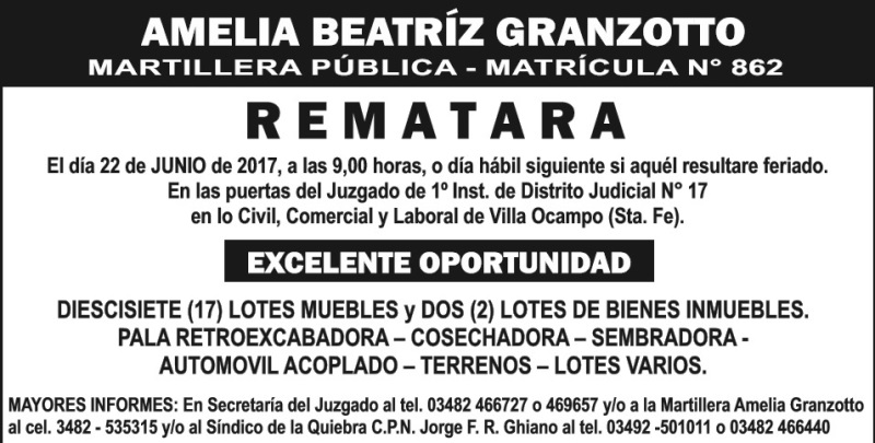 Por disposición de la Sra. Jueza a cargo del Juzgado de 1º Inst. de Distrito Judicial N° 17 en lo Civil, Comercial y Laboral de Villa Ocampo (Sta. Fe), Secretaría del autorizante, se ha ordenado que la Martillera Amelia Beatriz Granzotto (CUIT. N° 27-22.155.711-0), designada en los autos caratulados: “INAZA S.A S/CONCURSO PREVENTIVO – HOY QUIEBRA”, Expte. Nº 540/2012 CUIT 30-70822346-4, proceda a: VENDER en PUBLICA SUBASTA el día 22 de JUNIO de 2017, a las 9.00 horas o el día hábil siguiente a la misma hora si aquel resultare feriado, en puertas del Juzgado, SIN BASE Y AL MEJOR POSTOR, los siguientes bienes muebles que se detallan a continuación: