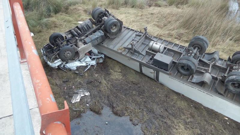 EL accidente ocurrió en el kilómetro 768 de la Ruta Nacional N°11, y el vehículo siniestrado es un camión Renault Tracker, dominio MFZ-218 de “Transporte Don Luis”, propiedad de Edgardo José Emer que conducía José Gustavo Fabián Gampieri de 27 años, domiciliado en Frank, por causas que se tratan de establecer se despistó y terminó cayendo del puente.