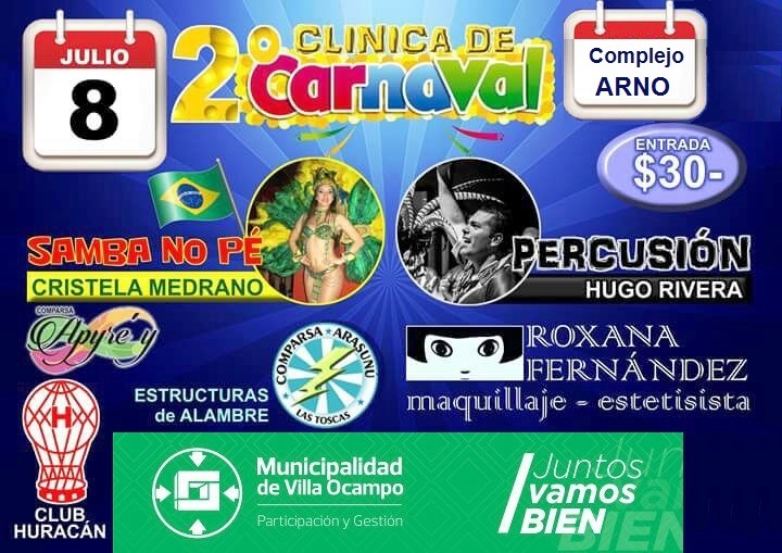 La Secretaría de Cultura y Comunicación de la Municipalidad de Villa Ocampo invita a la 2ª Clínica de Carnaval, que organiza el Club “Huracán” el sábado 8 de julio, de 10 a 20 horas en el Complejo “Arno”.