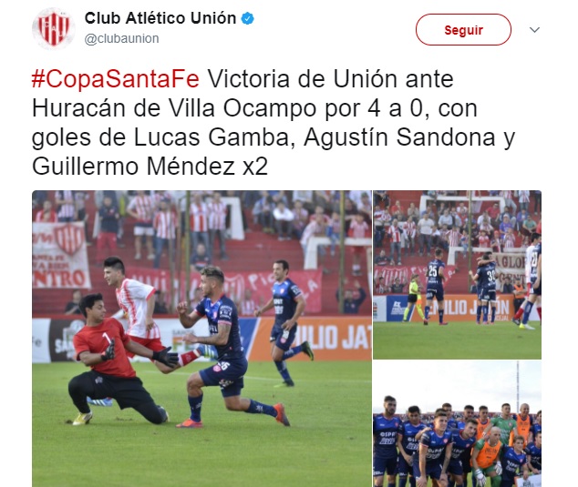 Unión de Santa Fe le ganó 4 a 0 a Huracán de Villa Ocampo por los octavos de final de la Copa Santa Fe. El partido se disputó este domingo en el estadio 15 de Abril.