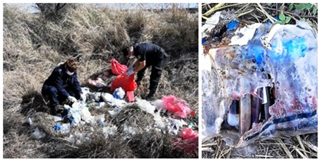 Gran cantidad de jeringas, tubos con sangre, guantes, pipetas, y otra gran cantidad de residuos patológicos altamenete contaminantes, esparcidos en un radio de unos 15 metros.