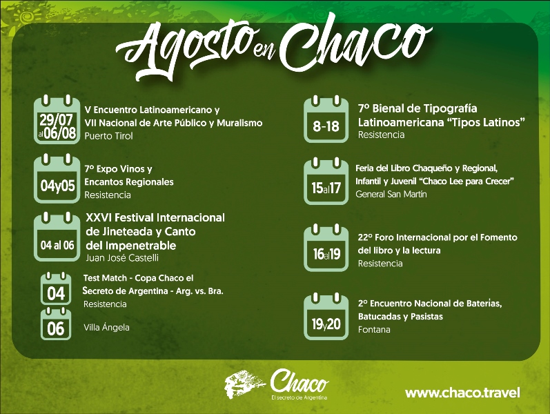 Estos y otros eventos como el Test Matchs Copa Chaco «el secreto de Argentina», partido entre Argentina y Brasil, que se realizará el 4 de agosto en Resistencia y el 6 en Villa Ángela; tendrán como epicentro localidades de la provincia del Chaco durante el mes de agosto. Para mayor información sobre eventos y atractivos del destino, pueden ingresar a www.chaco.travel; www.paraencontrarnos.com o en redes sociales: FACEBOOK y TWITTER.