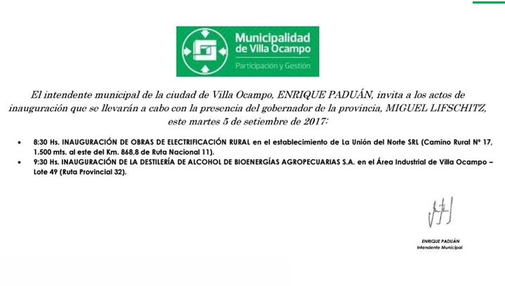 El intendente Enrique Paduán invita a compartir la presencia del gobernador Lifschitz, que estará presidiendo el acto inaugural de las flamantes instalaciones de la alcoholera Bioenergías, donde ya se desempeñan 30 empleados.