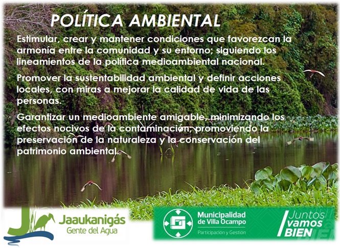 El Área de Turismo de la Municipalidad de Villa Ocampo informa que se definieron los lineamientos generales de la política ambiental de la ciudad, los que se encuentran enmarcados en el programa del Ministerio de Turismo de la Nación: “Directrices de Gestión Ambiental para Prestadores Turísticos”, al que adhirió el municipio y los prestadores turísticos locales.