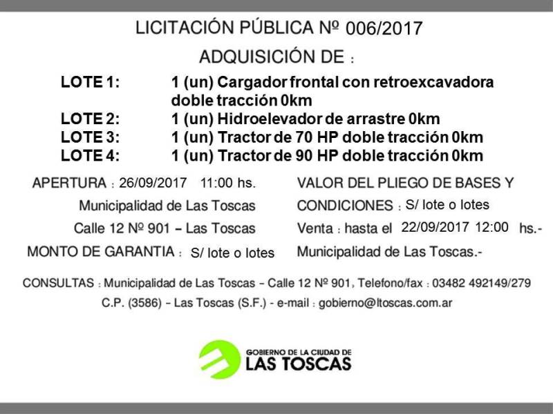 El gobierno de la ciudad de Las Toscas, hace el llamado a Licitación N°006/2017 para la adquisición de maquinarias y ampliación del parque automotor e invita a presentar ofertas para la compra de: